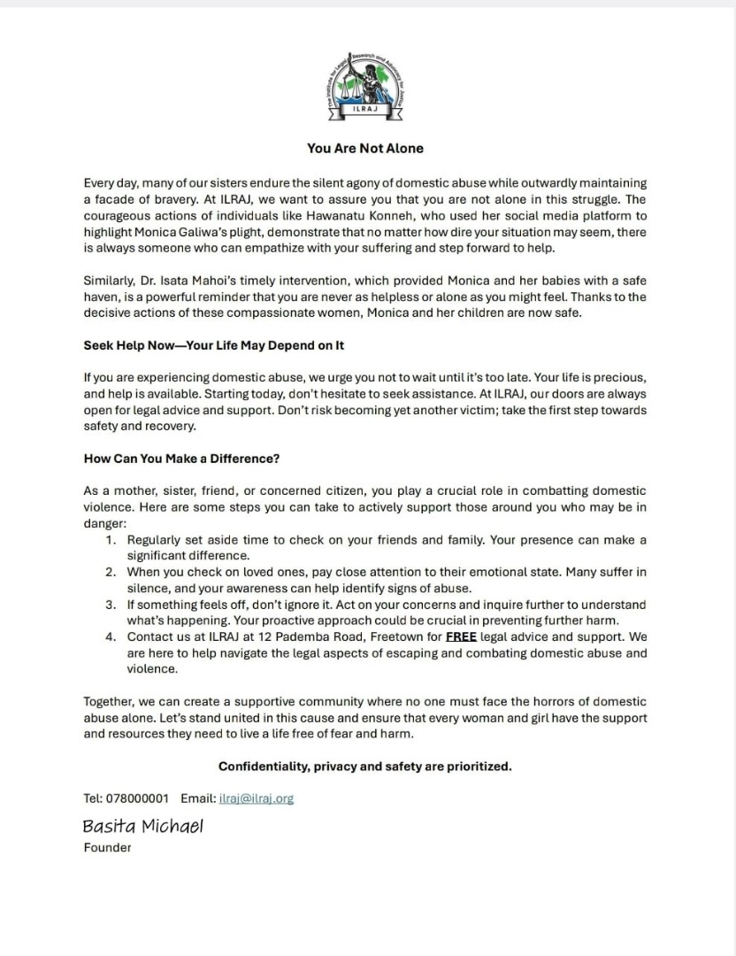 According to ILRAJ, many women suffer silently from domestic violence while maintaining a facade of bravery. The organization highlighted the involvement of Hawanatu Konneh, who used her social media platform to draw attention to the domestic abuse of Monica Galiwa. Additionally, ILRAJ praised Dr. Isata Mahoi’s intervention, which provided Monica and her children with a safe haven.