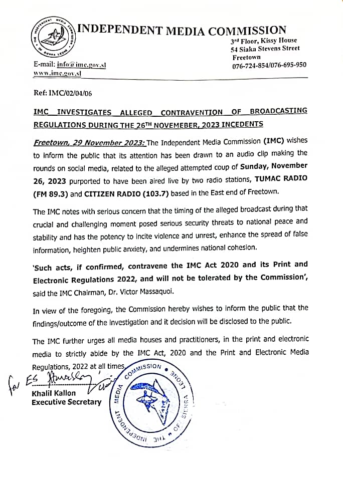 The Independent Media Commission (IMC) has launched an investigation into an alleged broadcast made by Tumac Radio and Citizen Radio that is linked with the November 26th attempted coup in Freetown.