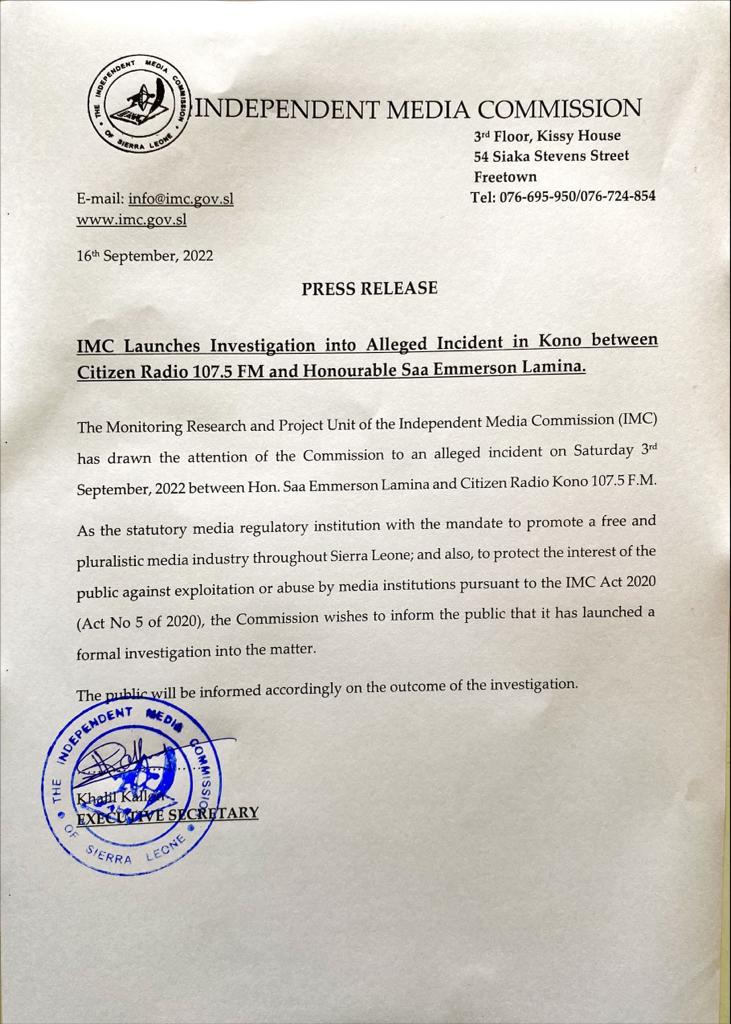 “The Monitoring Research and Project Unit of the Independent Media Commission (IMC) has drawn the attention of the Commission to an alleged incident on Saturday 3rd September, 2022 between Hon. Saa Emmerson Lamina and Citizen Radio Kono 107.5 F.M,” IMC stated