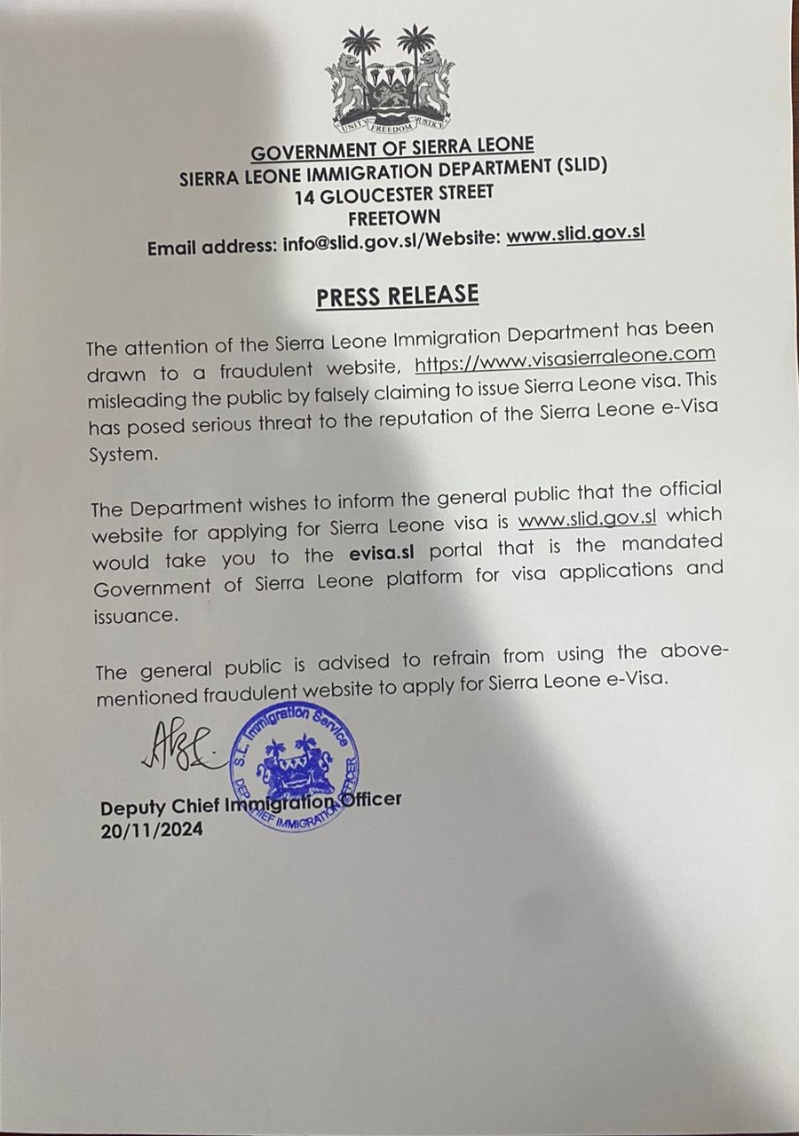 The Sierra Leone Immigration Department (SLID) has issued a public warning regarding a fraudulent website,https://www.visasierraleone.com/ which falsely claims to issue Sierra Leone visas.