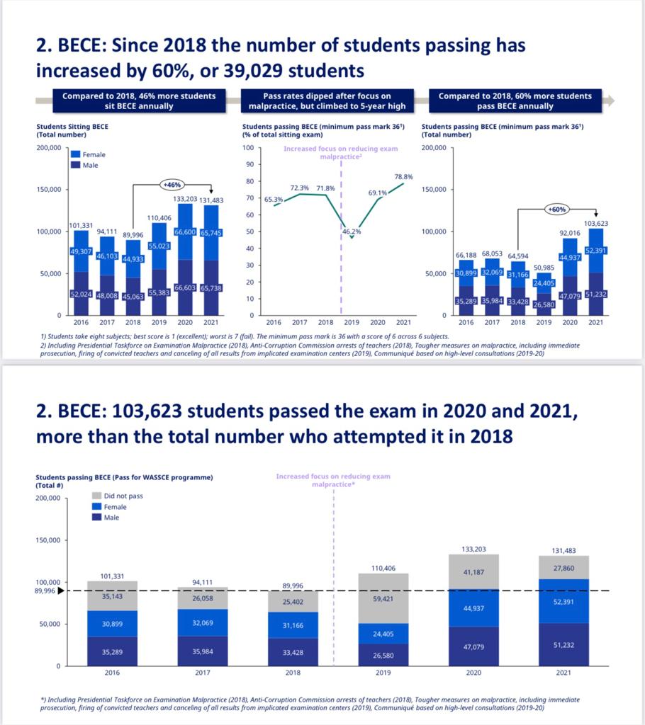 According to the Strategic communication Analyst, Ministry Of Basic Senior Secondary Education Augustine Sankoh, stated in a release that Since 2018 the annual number of students passing the Basic Education Certificate Examination (BECE) has increased by 60%, or 39,029 students nationwide.