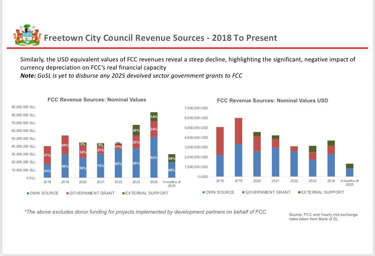 The charts further show that while FCC’s own-source revenue now makes up the majority share of total income, government grants have dwindled, with no devolved sector funding received for 2025 to date. External donor support has become an increasingly vital supplement in recent years.