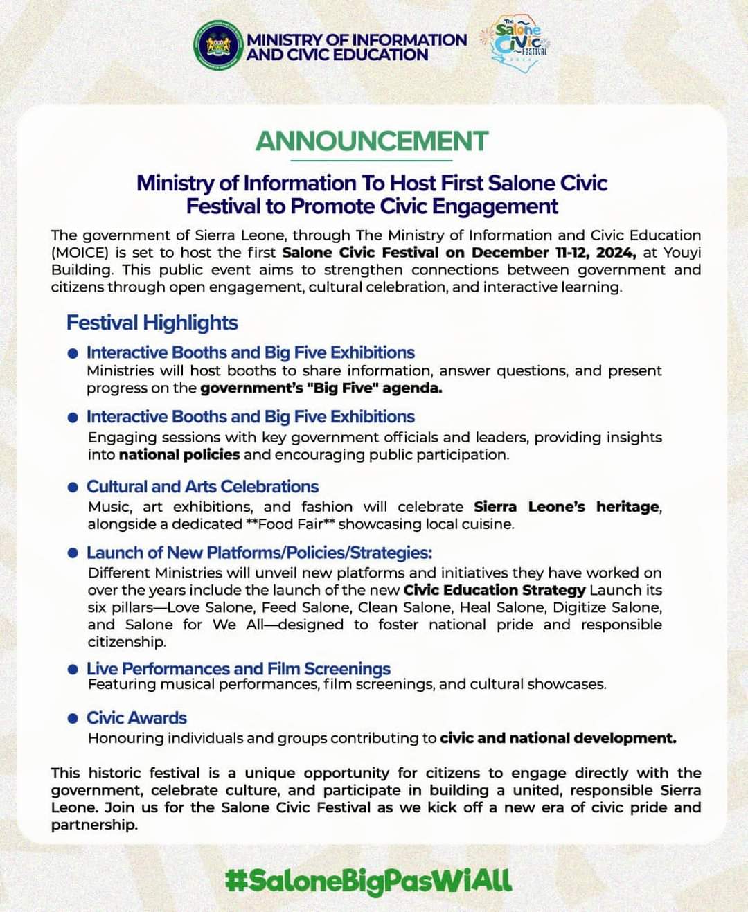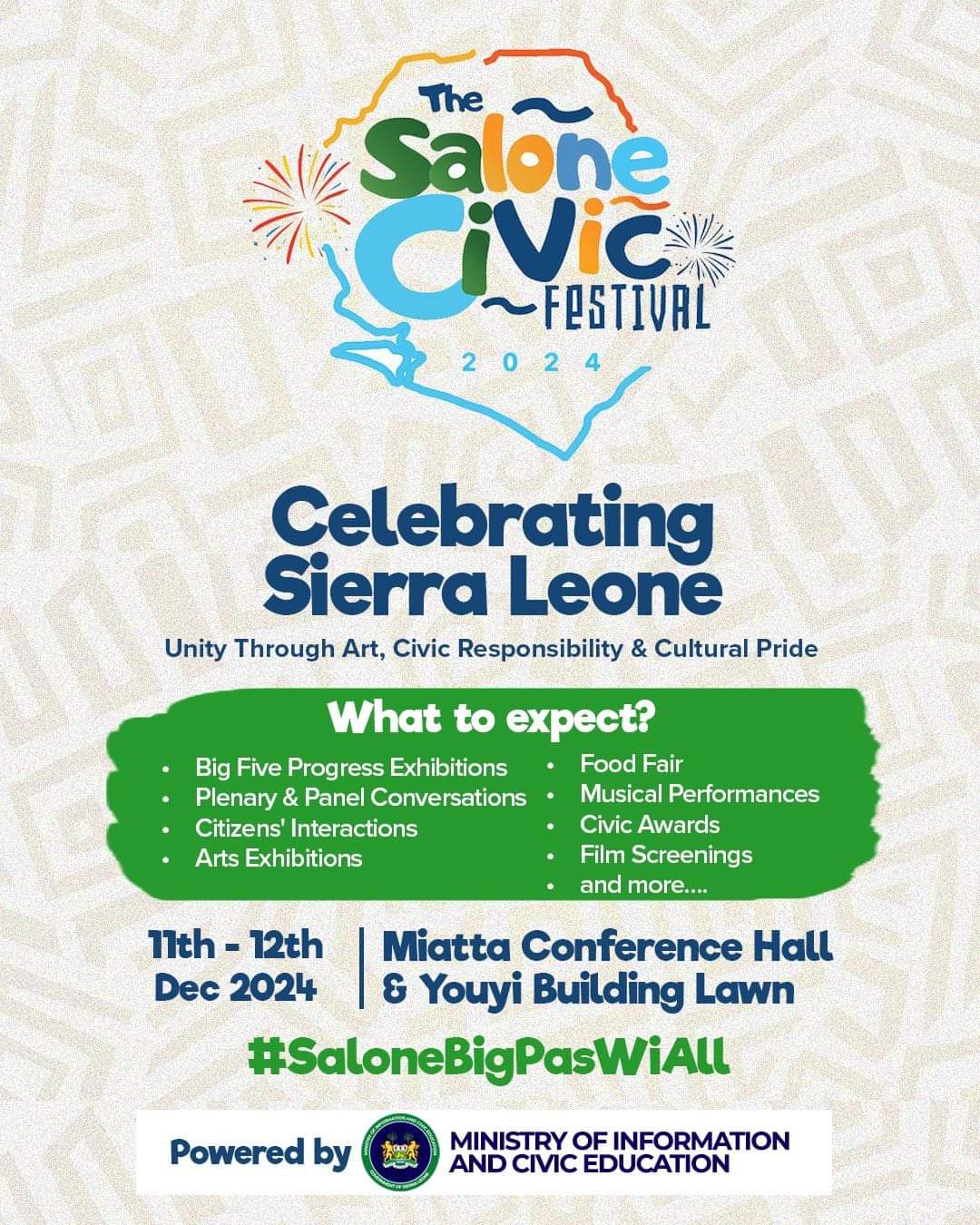 As Sierra Leone embarks on this new chapter of civic engagement, the Ministry of Information and Civic Education invites all citizens to attend and be part of the festival, which aims to kick-start a new era of partnership between the government and its people.
