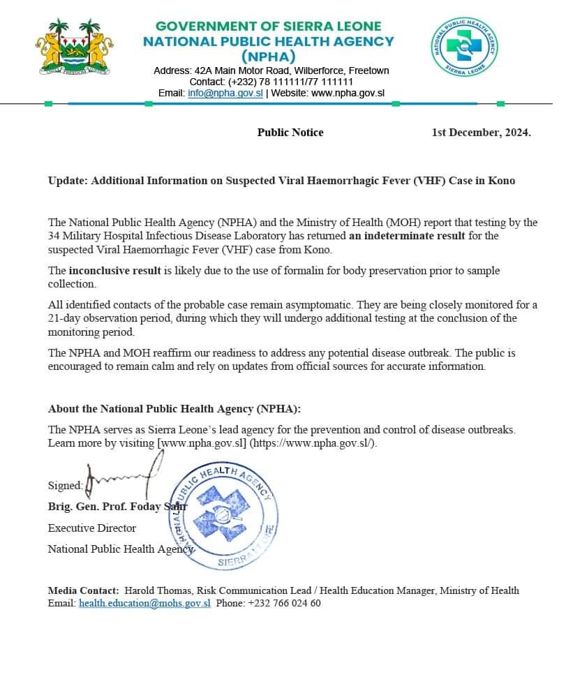 The Government of Sierra Leone, through the National Public Health Agency (NPHA), has issued an update on the suspected Viral Haemorrhagic Fever (VHF) case reported in Kono.