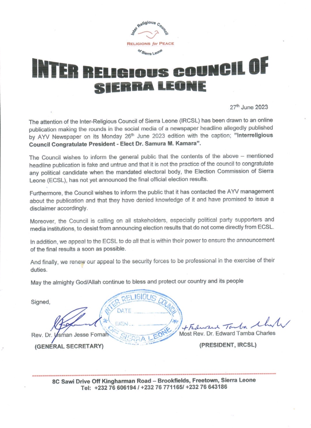 The Council, which represents a diverse range of religious groups in Sierra Leone, emphasized that it is not their practice to congratulate any political candidate before the official announcement of election results by the mandated electoral body, the Election Commission of Sierra Leone (ECSL).