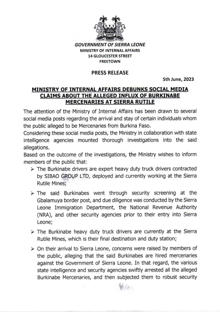 The Ministry of Internal Affairs issued a press release on Monday, June 5th, 2023, debunking the claims circulating on social media about an alleged influx of Burkinabe mercenaries at Sierra Rutile.