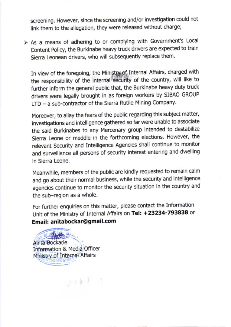 The Ministry of Internal Affairs, responsible for the country’s internal security, would like to further inform the public that the Burkinabe heavy-duty truck drivers were legally brought in as foreign workers by SIBAO GROUP LTD, a subcontractor of the Sierra Rutile Mining Company.