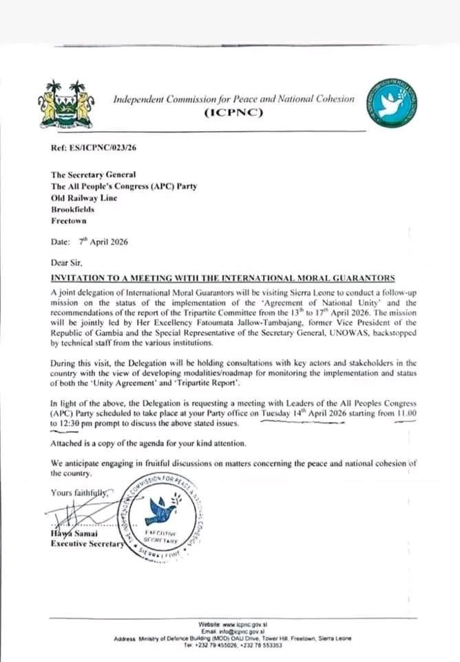 The Independent Commission for Peace and National Cohesion (ICPNC) has formally informed the All People’s Congress (APC) Party of an upcoming engagement with a visiting delegation of International Moral Guarantors, as part of ongoing efforts to advance the implementation of the Agreement for National Unity and the recommendations of the Tripartite Committee report.