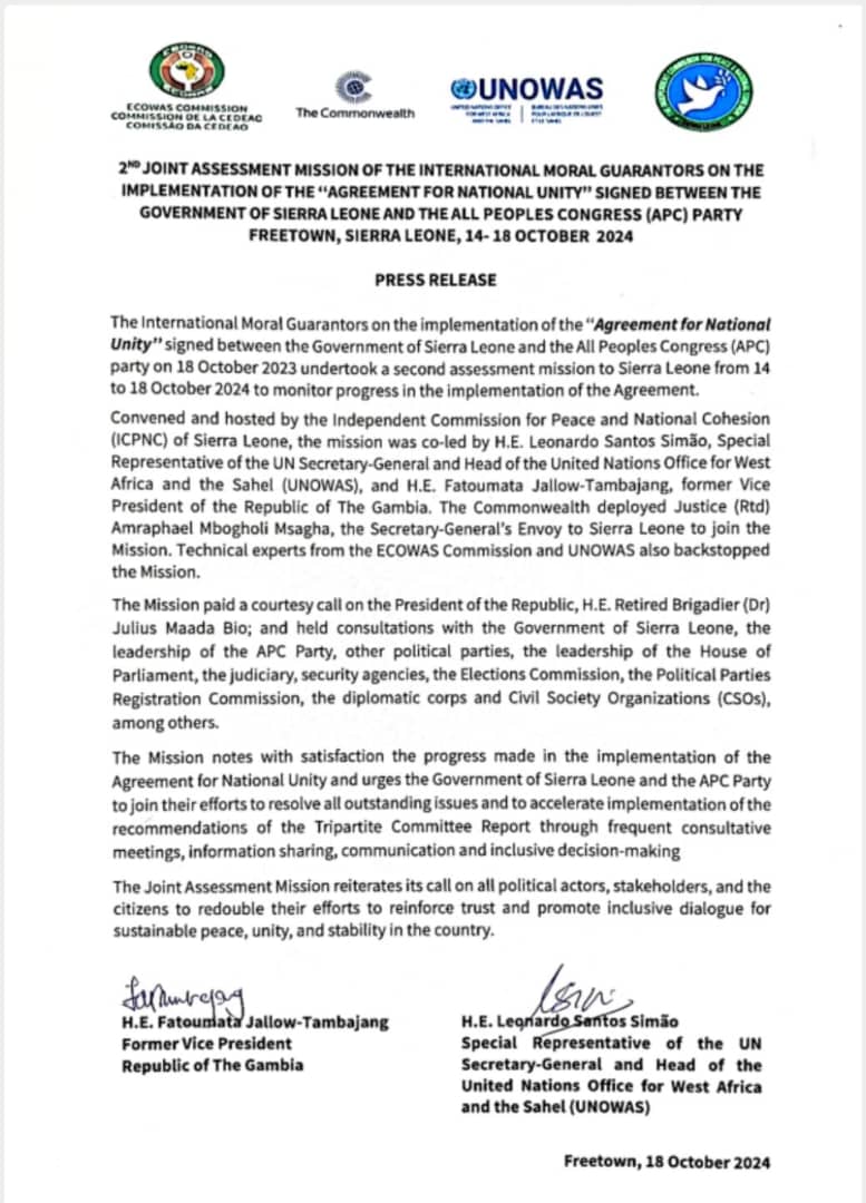 The International Moral Guarantors overseeing the implementation of the “Agreement for National Unity” between the Government of Sierra Leone and the All Peoples Congress (APC) Party have concluded their second assessment mission to the country.