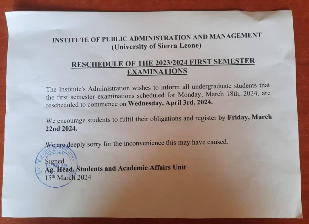 The Institute of Public Administration and Management (IPAM) University of Sierra Leone has issued a public statement informing undergraduates that the institution has rescheduled its first Semester Examinations.