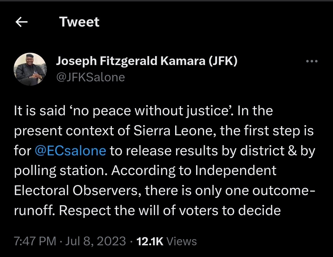 Kamara, commonly referred to as JFK, emphasized the importance of justice in achieving peace and called for the release of election results by district and polling station.
