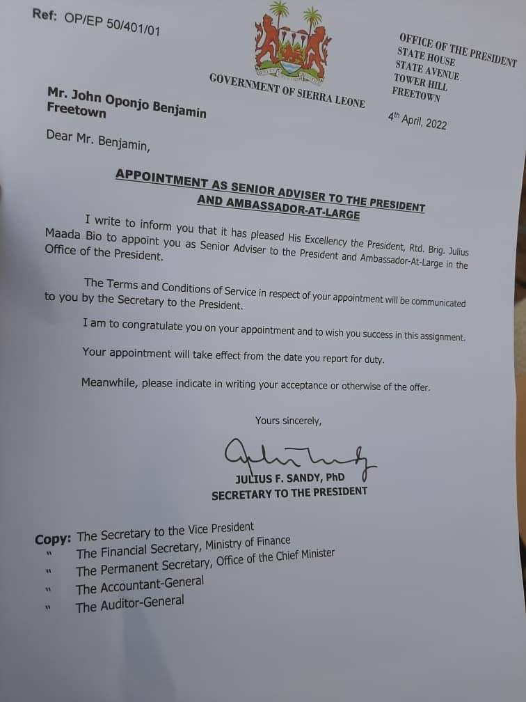 John Oponjo Benjamin (JOB) has today been appointed as Senior Adviser To The President and Ambassador At Large.