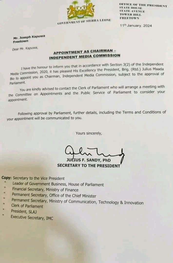 President Bio has appointed the outgoing Director-General of SLBC, Joseph Kapuwa, the new Chairman of the Independent Media Commission. As a lawyer and communications professional, Joseph is expected to utilize his unique experiences to oversee and effectively regulate the media landscape.
