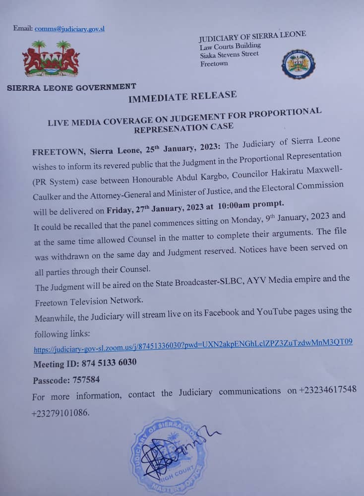 The Judiciary of Sierra Leone has informed the general public that Judgement in the Proportional Representation (PR system) case between Hon. Abdul Kargbo and Councillor Hakiratu Maxwell-Caulker against the Attorney General and Minister of Justice and The Electoral Commission of Sierra Leone will be delivered on the 27th January, 2023.