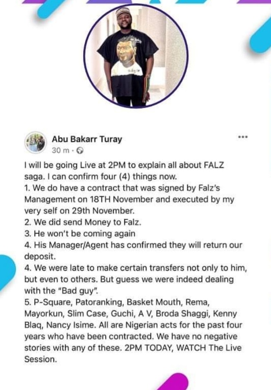 The CEO of ECO FEST, Abu Bakarr Turay popularly known as ‘The Kabaka’ has in a post on social media reacted to the Falz ECO FEST saga.