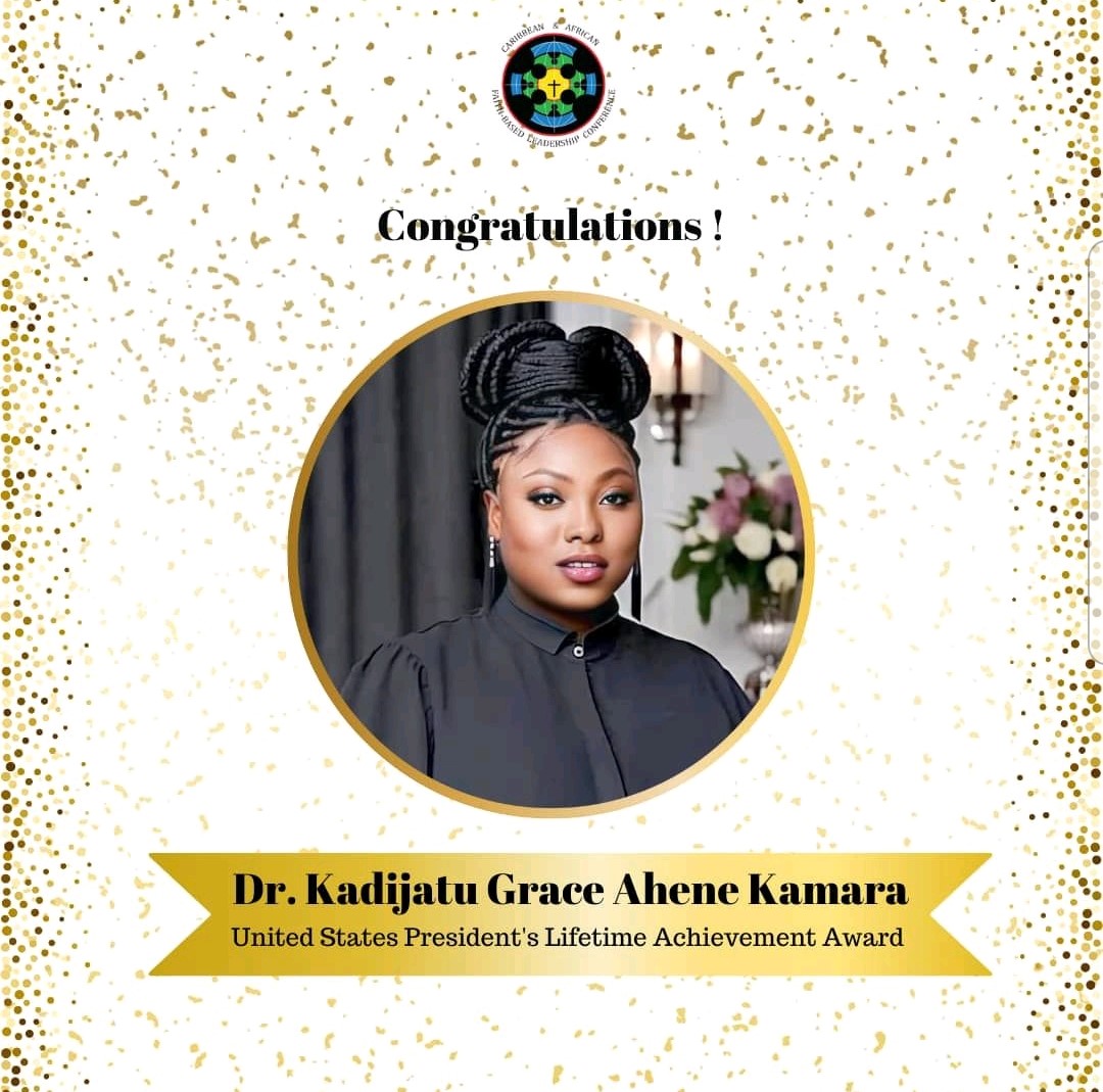 Sierra Leone’s Deputy Minister of Tourism and Cultural Affairs, Dr. Kadijatu Grace Ahene Kamara has been awarded the United States President’s Lifetime Achievement Award.