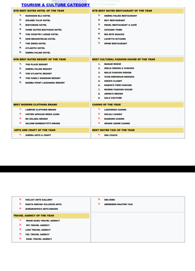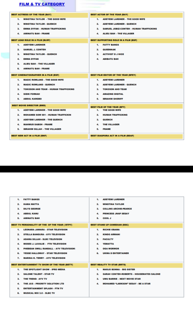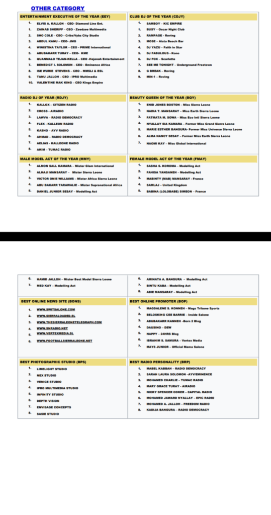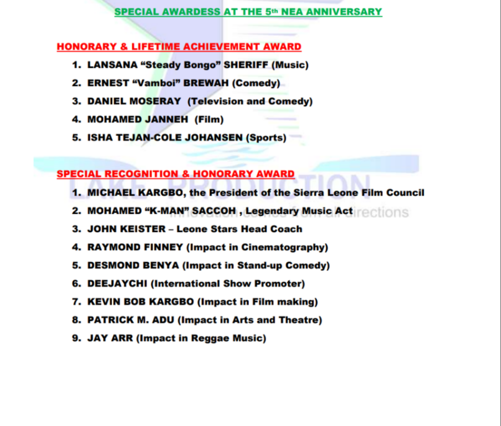 The National Entertainment Awards ceremony is the biggest and ultimate annual national entertainment event designed to celebrate talented Sierra Leoneans with artistic skills for personal and interpersonal growth. The event is organized by LAKE Productions (SL) Ltd.