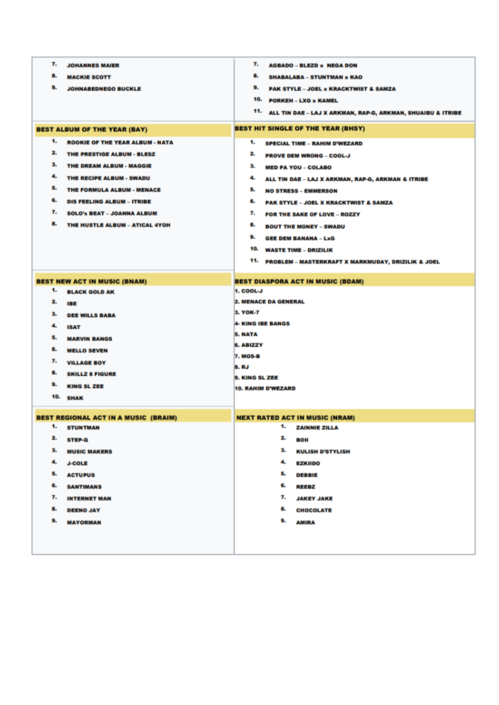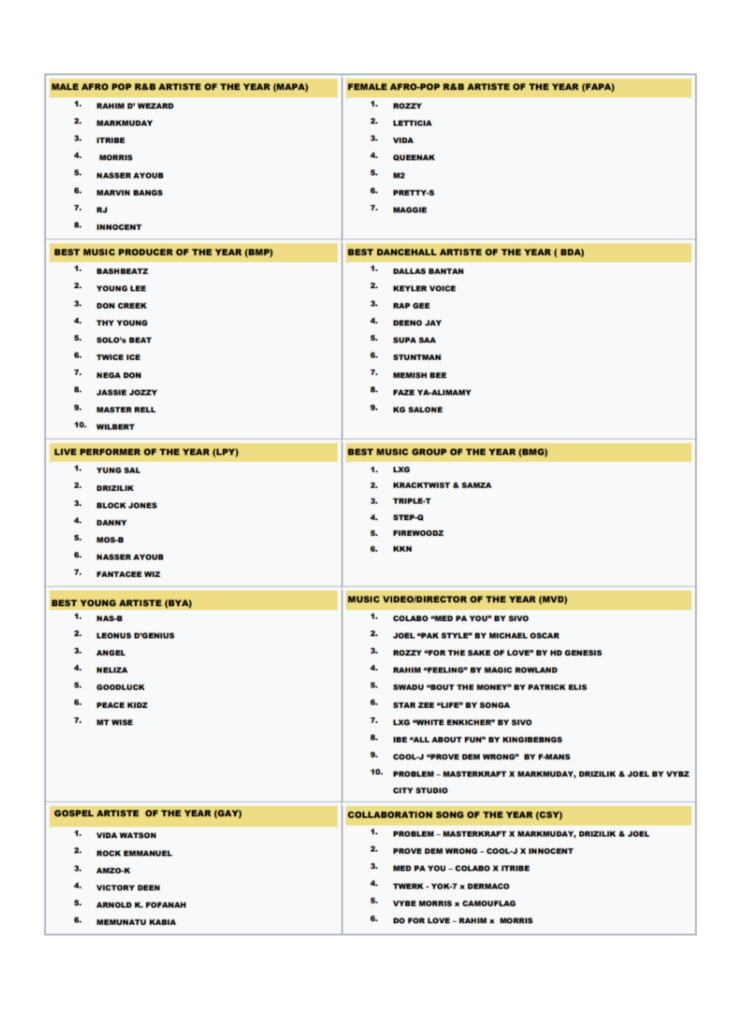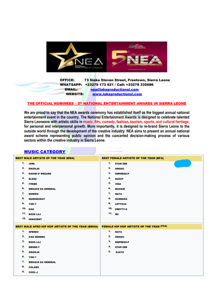 Top Sierra Leonean artistes have been nominated for the 2021 National Entertainment Awards (NEA) that will be taking place on 23rd December, 2021 at the Radisson Blu Hotel in Aberdeen, Freetown.