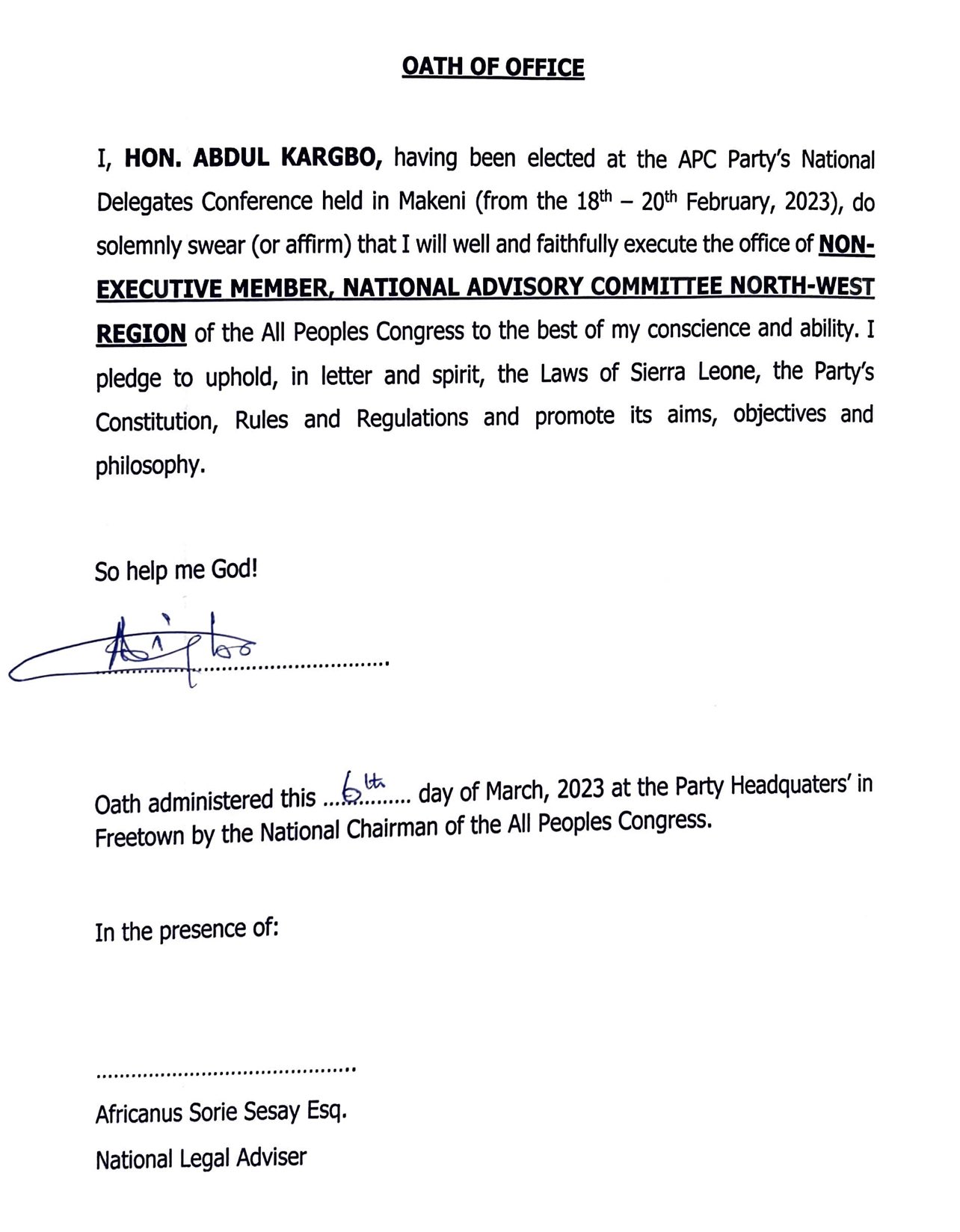 “I have subscribed the oath of office ofNon-Executivee Member, National Advisory Committee of the APC. On Monday 13th March, NAC will approve the Running Mate and Deputy Leader. The National Chairman and his entire executive are poised to lead the party to state house June 24,” Hon. Kargbo stated.