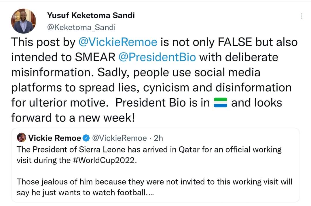 Because of this, Yusuf Keketoma Sandi felt annoyed and posted that Vickie Remoe’s post is not only FALSE but that it is also intended to SMEAR President Bio with deliberate misinformation.