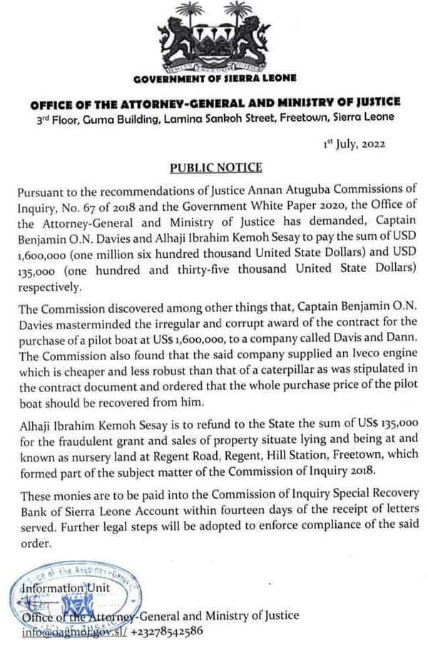 According to notice released from the office of the Attorney-General and Minister of Justice dated 1st July 2022, it was clearly stated that Alhaji Kemoh Sesay has got bearly a fortnight to pay the money into the Commission of Inquiry special recovery Bank of Sierra Leone Account.