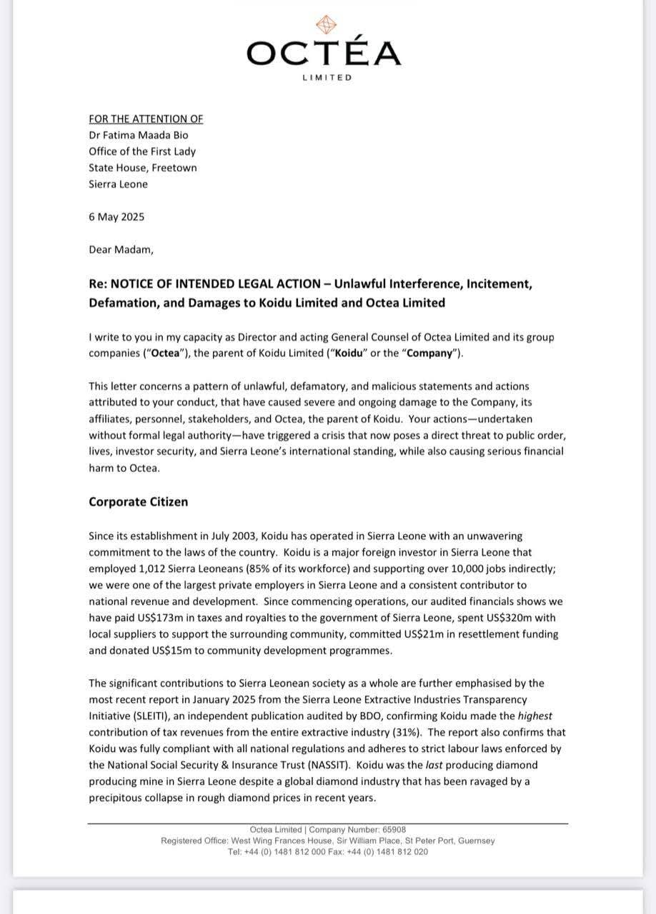 Octéa Limited, parent company of Koidu Limited, has formally threatened legal action against Sierra Leone’s First Lady, Dr. Fatima Maada Bio, accusing her of unlawful interference, defamation, incitement, and actions that have allegedly inflicted severe financial and reputational damage on the company and the country.