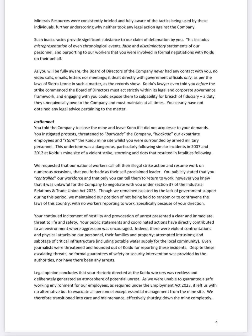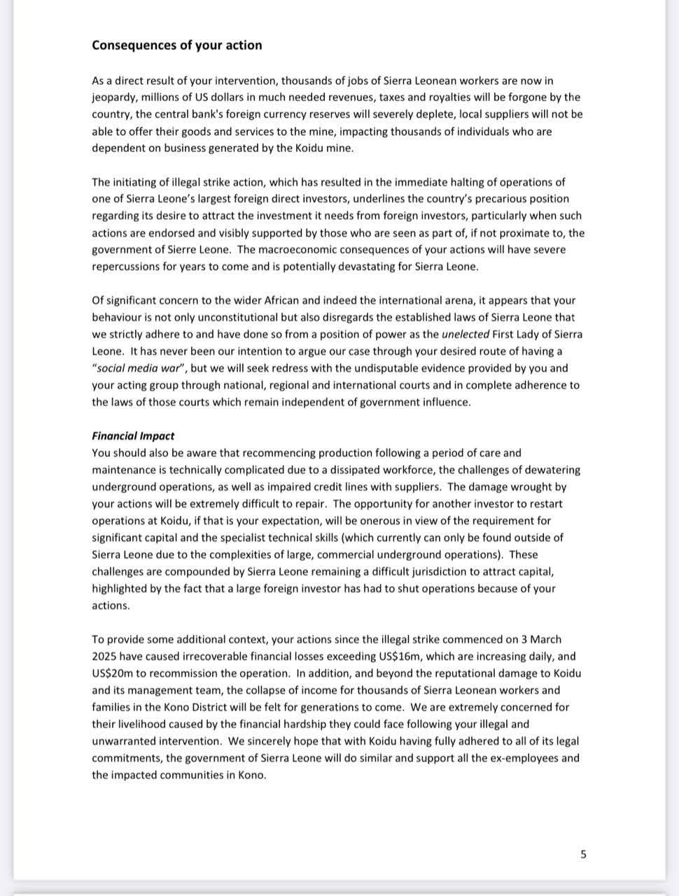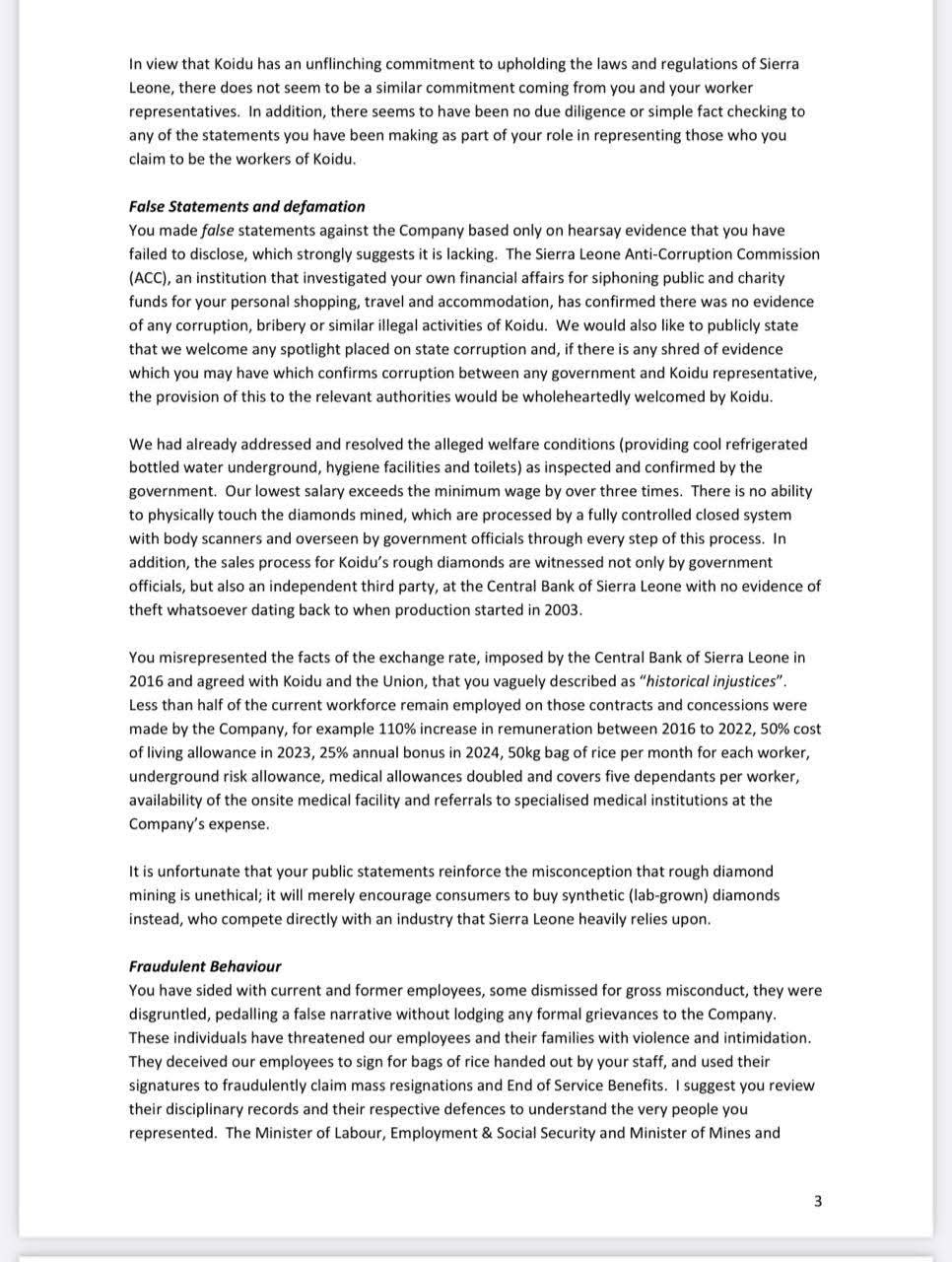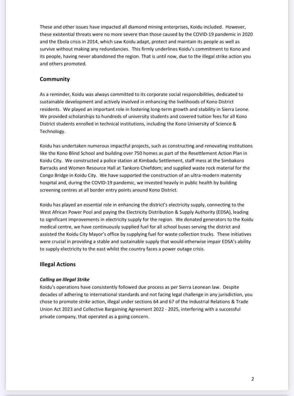 The letter also cited the 2025 Sierra Leone Extractive Industries Transparency Initiative (SLEITI) report, which confirms that Koidu made the highest tax contribution in the extractive sector and was fully compliant with all national labor regulations.