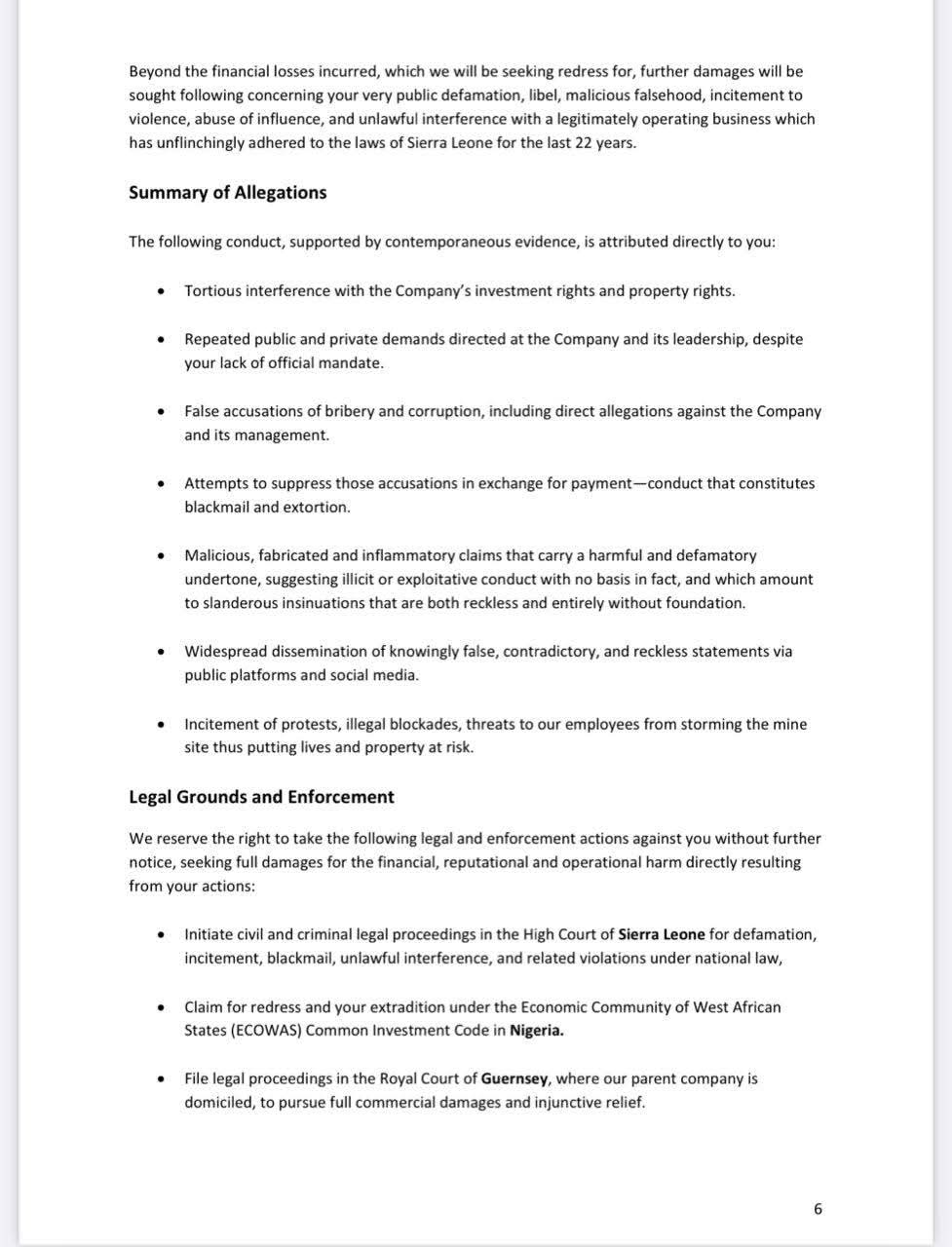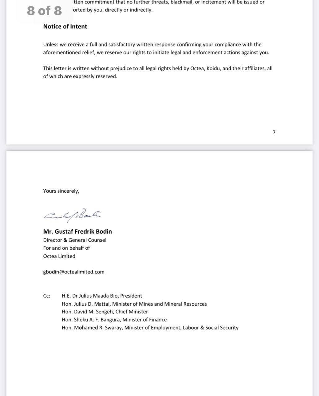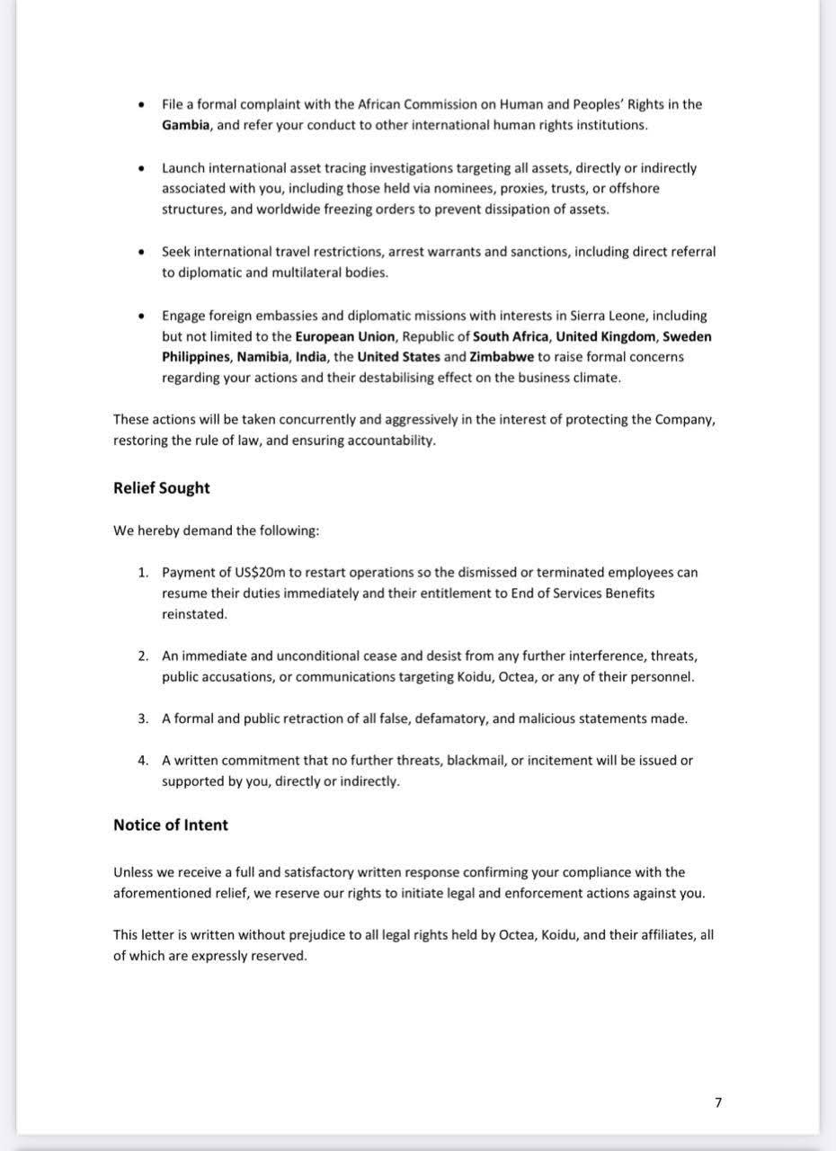 In a letter dated May 6, 2025, and addressed to the Office of the First Lady, Octéa’s Acting General Counsel and Director alleged that Dr. Bio’s public conduct, including what it describes as the unlawful promotion of a strike and false statements, has caused “a crisis that now poses a direct threat to public order, lives, investor security, and Sierra Leone’s international standing.”