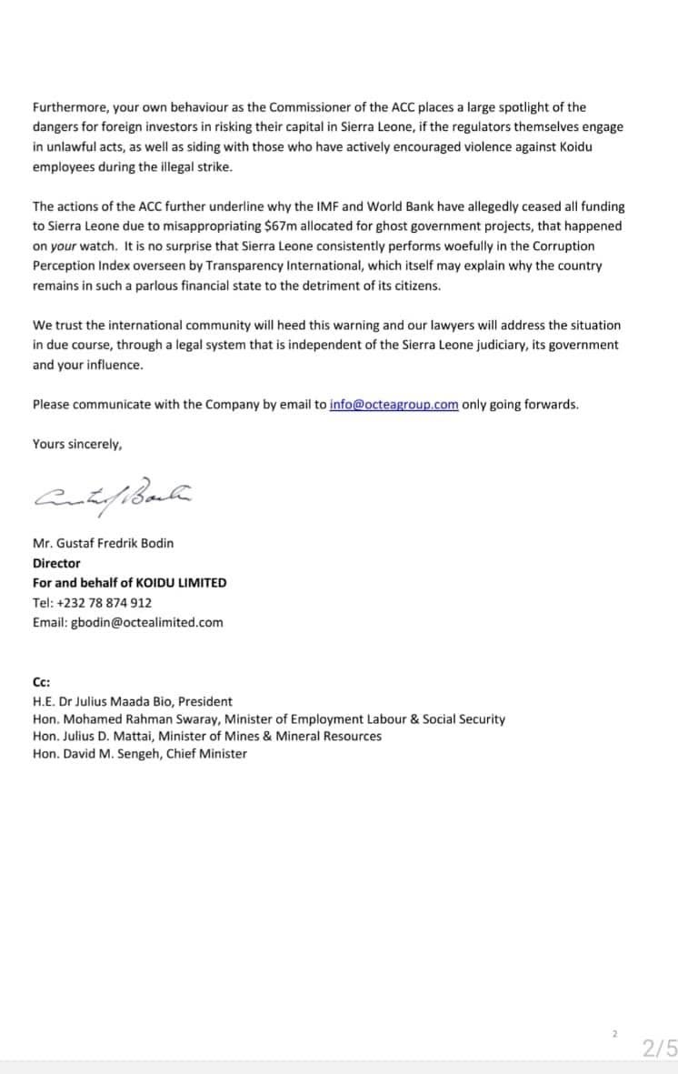 The letter describes the ACC’s behavior as a “corrupt matter, facilitated by a bogus investigation,” and an “assault on a lawfully abiding company that reinforces the unfriendly business environment of Sierra Leone.”
