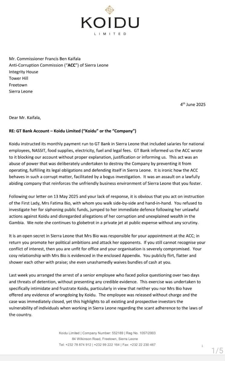 The letter further claims that the ACC’s actions are influenced by instructions from the First Lady, Mrs. Fatima Bio, who Koidu Limited alleges is using the ACC to “siphon public funds.” Koidu Limited states it refused to investigate Mrs. Bio for “disregarded allegations of her corruption and unexplained wealth.” The company also claims that Mrs. Bio’s “very close relationship with Mrs. Bio is evidenced in the enclosed Appendix,” and that she “unashamedly waives bundles of cash at you.”