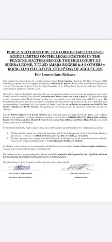 Former employees of Koidu Limited have issued a public statement to clarify their position in the ongoing High Court proceedings against the company, emphasizing that the Government of Sierra Leone is not involved and has no authority to negotiate on their behalf.