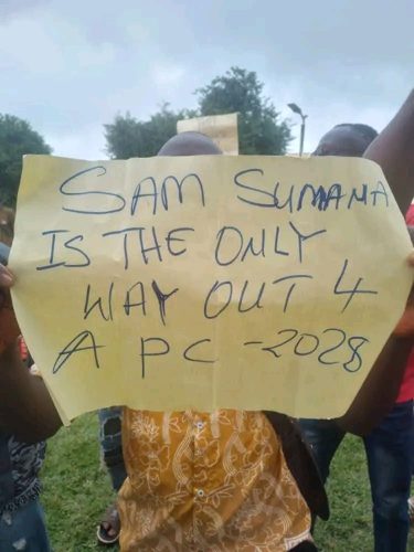 The messages on the placards included calls for the APC to give Sam Sumana a chance, warnings that the party could lose without Kono’s support, and appeals for other political figures to step back from his presidential ambition. Supporters described him as the only option they trust to lead the APC to victory in the next election.