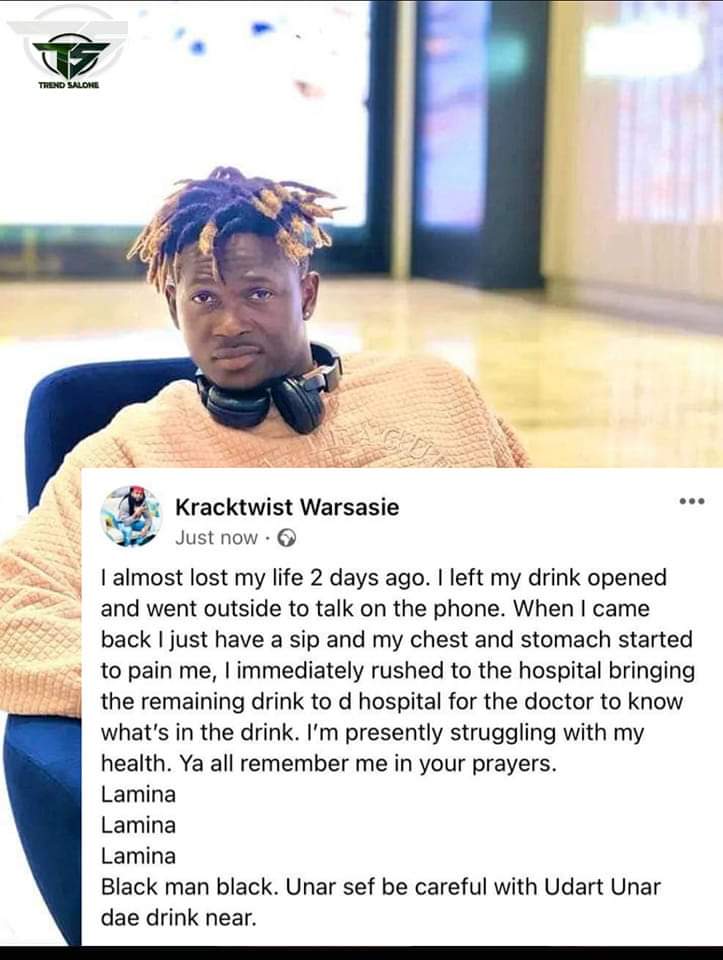 Popular Sierra Leonean Rapper Ishmael Kamara who is popularly known as racktwist has revealed that he’s presently battling with his health due to suspected food poisoning.