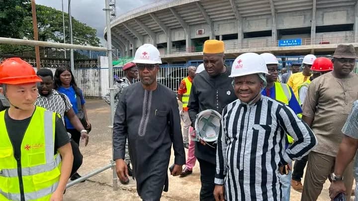 The Ministry of Employment, Labour and Social Security, Mohamed Rahman Swaray , on a visit to the National Stadium Rehabilitation Site, to assess work environment and conditions of workers; as well as remind workers of their rights and responsibilities.