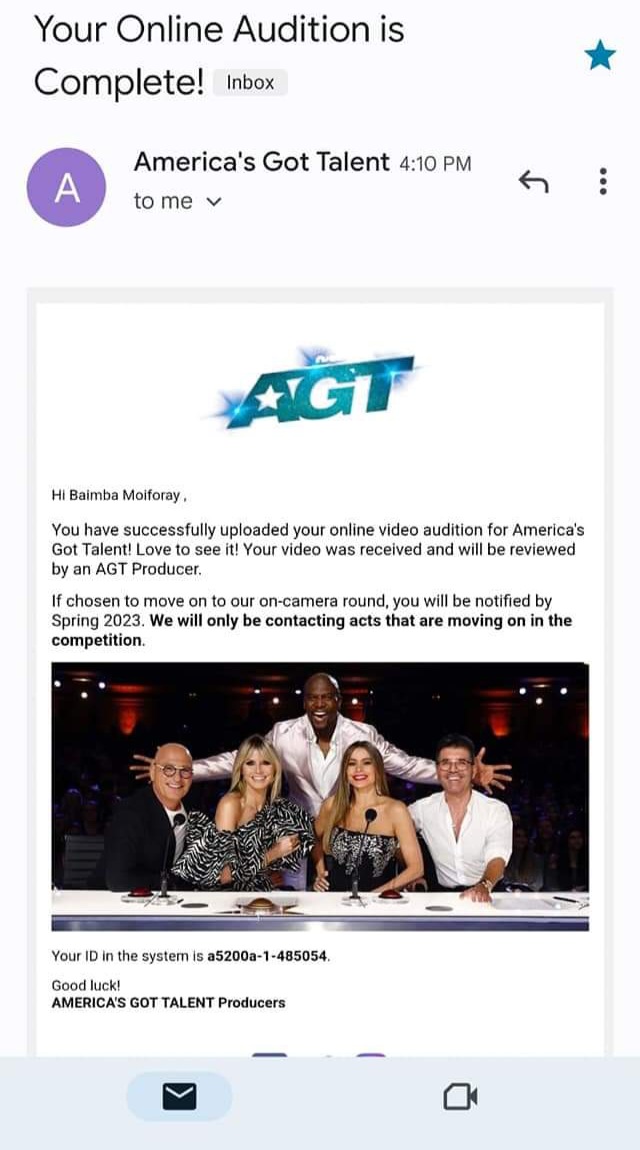 “You have successfully uploaded your online video audition for America’s Got Talent! Love to see it! Your video was received and will be reviewed by an AGT Producer.