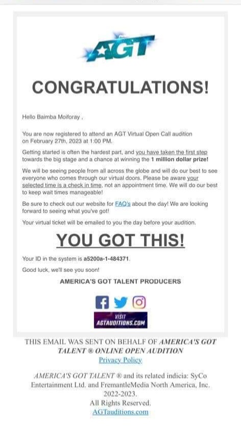 You are now registered to attend an AGT Virtual Open Call audition on February 27th, 2023 at 1:00 PM.
