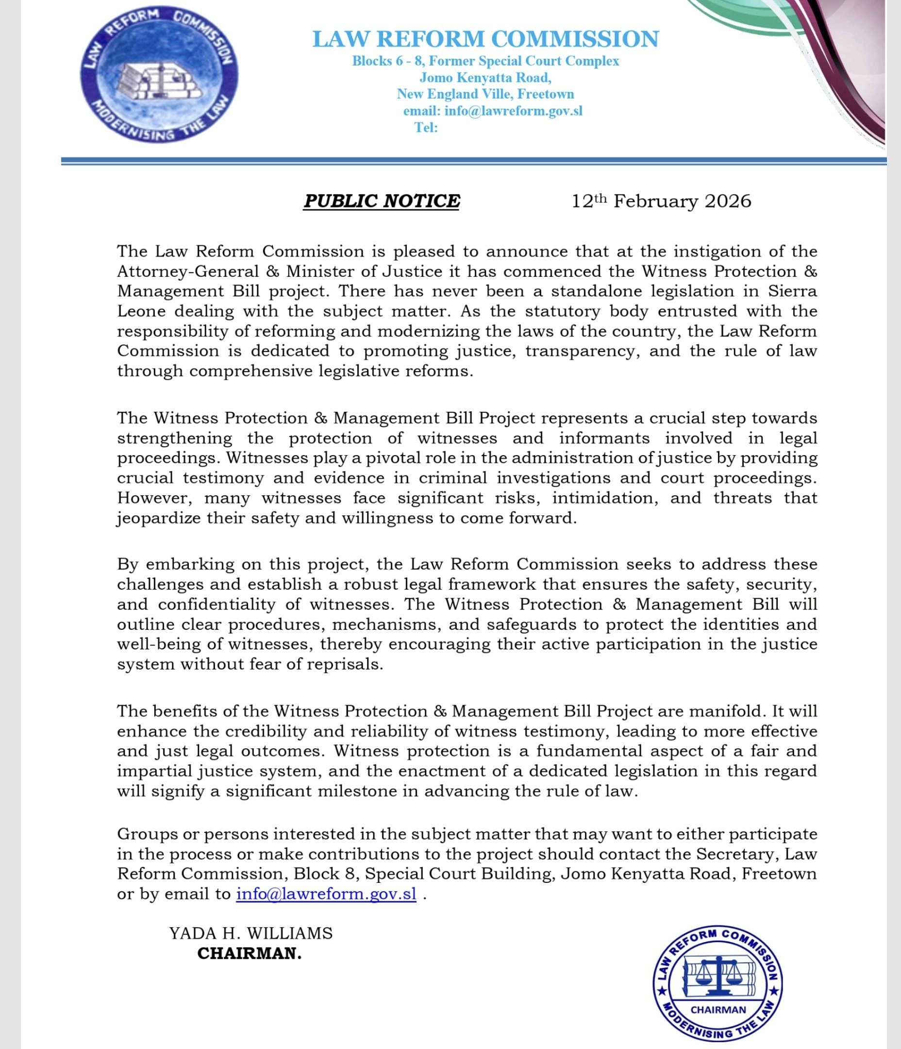 The Law Reform Commission of Sierra Leone has officially commenced the “Witness Protection & Management Bill” project, a move aimed at establishing the country’s first standalone legislation dedicated to the safety and management of witnesses and informants.