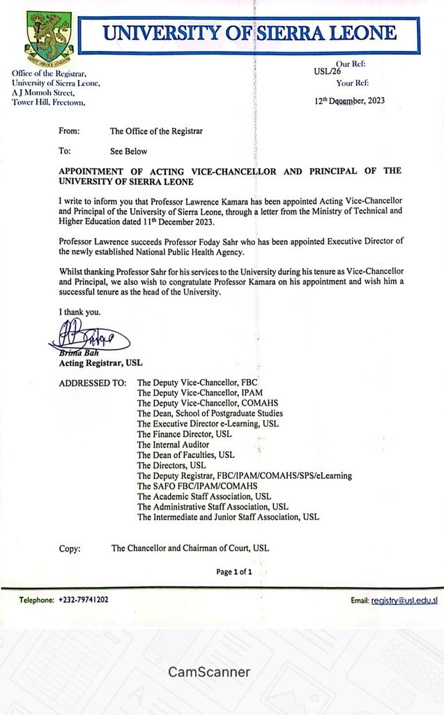 The official letter from the university reads: “I write to inform you that Professor Lawrence Kamara has been appointed Acting Vice-Chancellor and Principal of the University of Sierra Leone.” It further extends congratulations to Professor Kamara on his new appointment and wishes him a successful tenure steering the university.