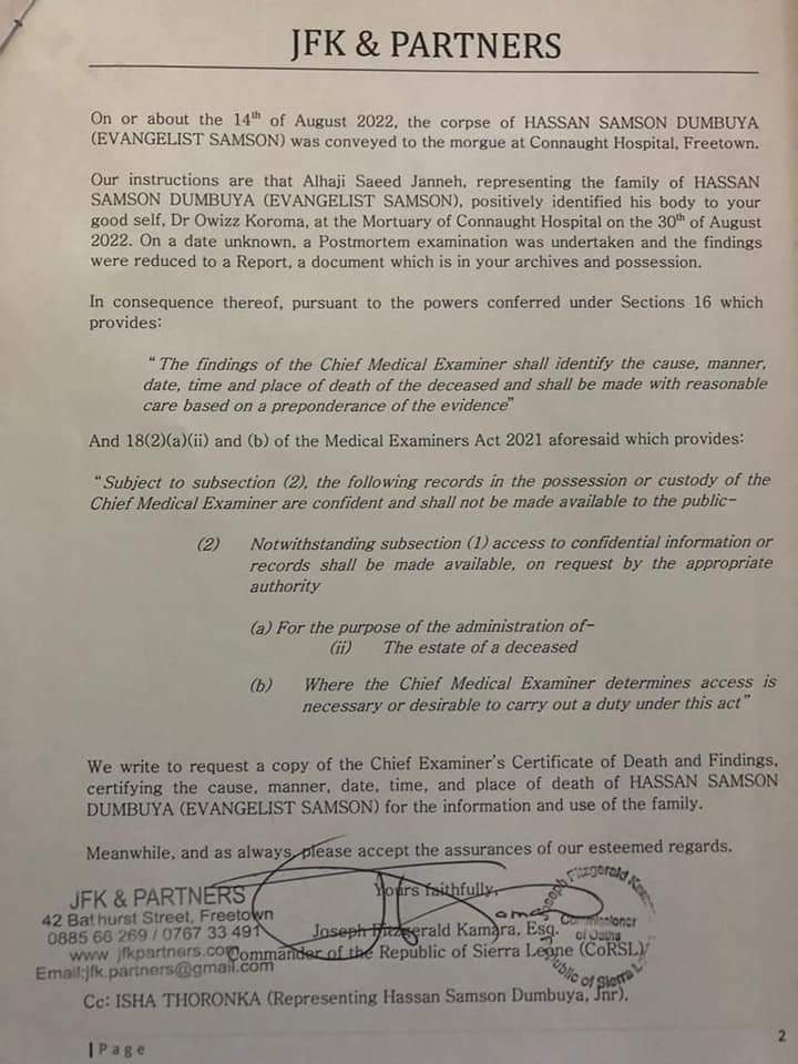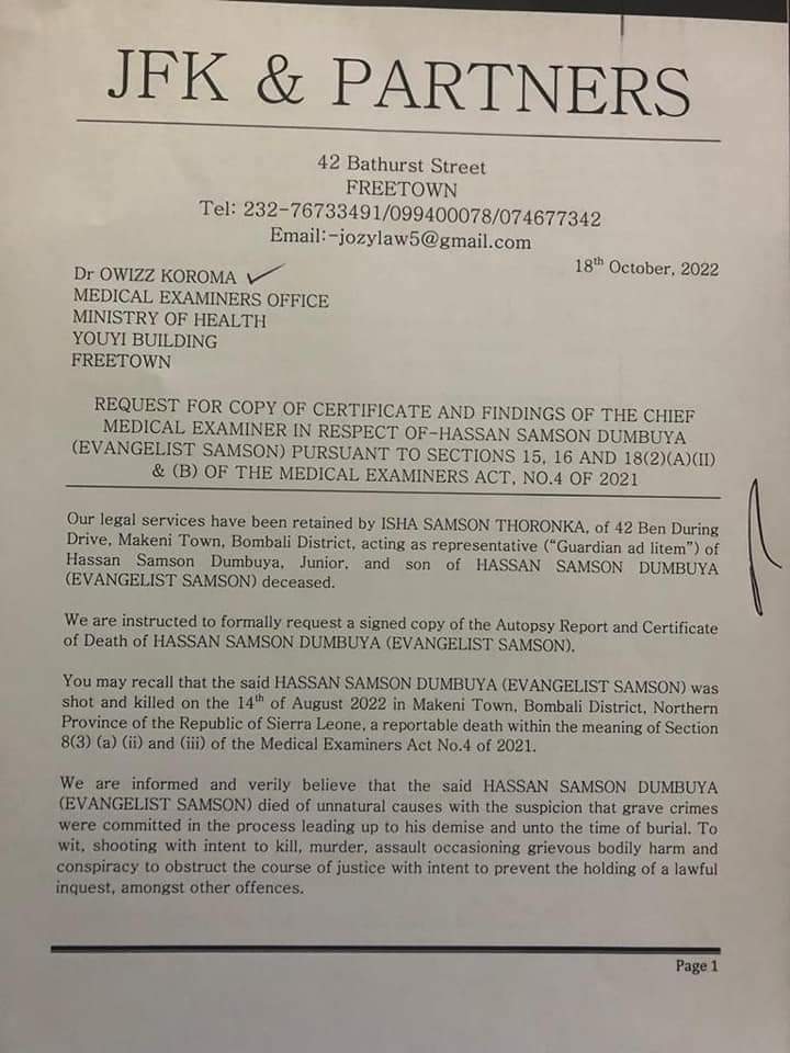 JFK & Partners, a leading law firm in Sierra Leone have today, Tuesday 18 October 2022, requested for a signed copy of the Autopsy Report and Certificate of Death of Hassan SAMSON Dumbuya aka Evangelist Samson, who was killed in an alleged exchange shootings with police officers in Makeni on Sunday 14th August 2022.