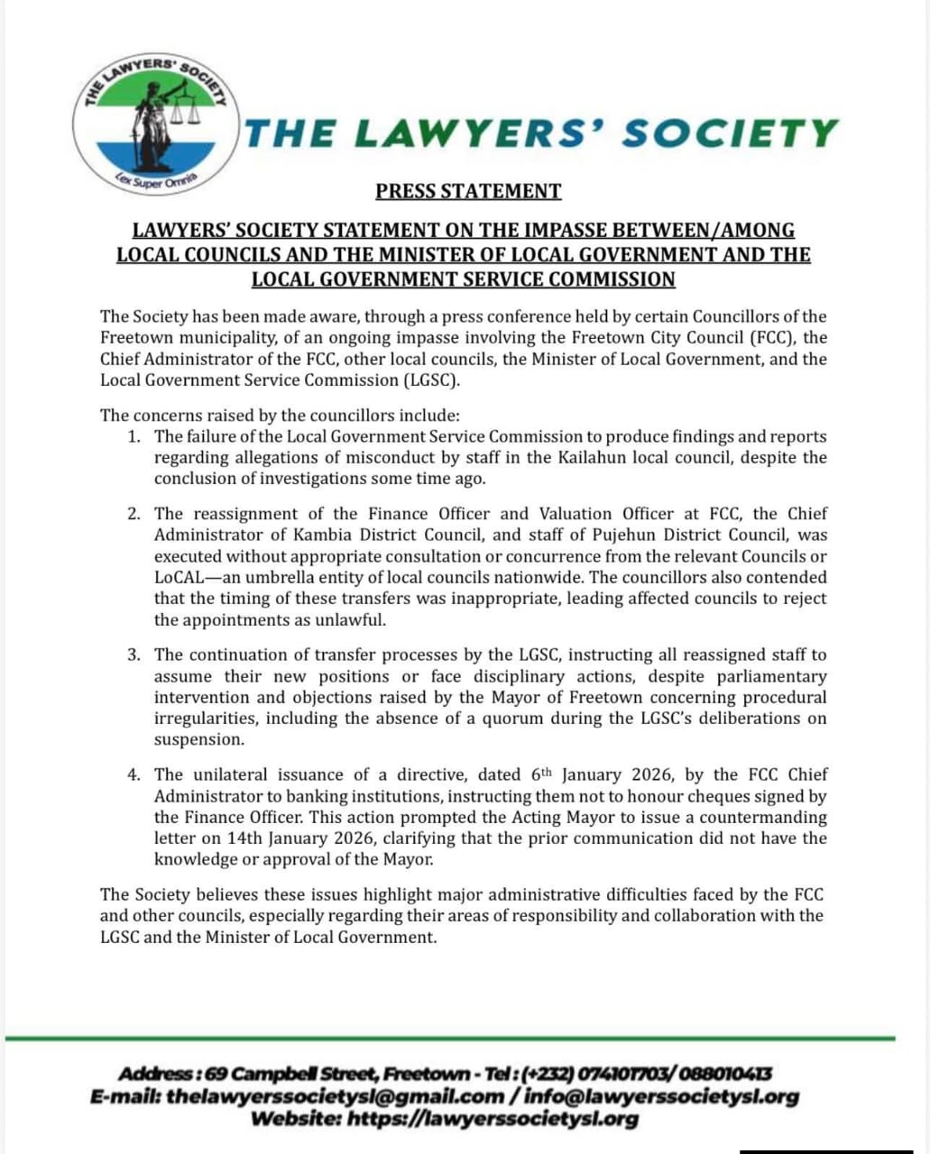 In the statement dated January 29, 2026, the Society expressed serious concern over a deepening rift involving the Freetown City Council (FCC), the Minister of Local Government, and the Local Government Service Commission (LGSC). The Society described the situation as a threat to the effective functioning of municipal governance in the capital.