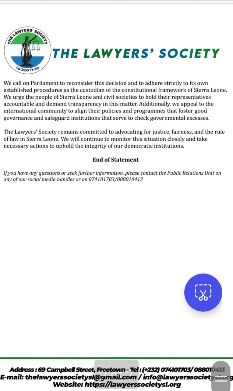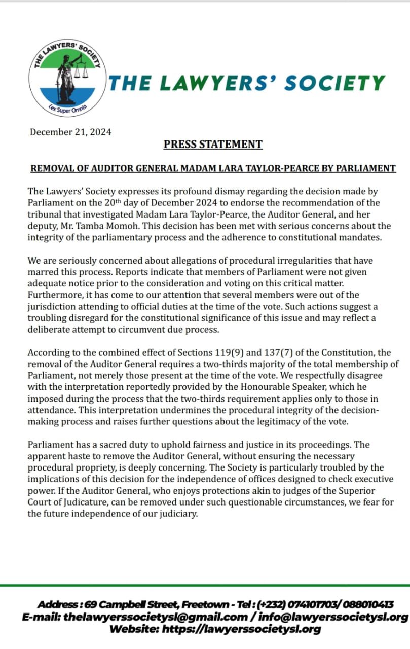 The Lawyers’ Society of Sierra Leone has strongly condemned Parliament’s decision to remove Auditor General Madam Lara Taylor-Pearce.