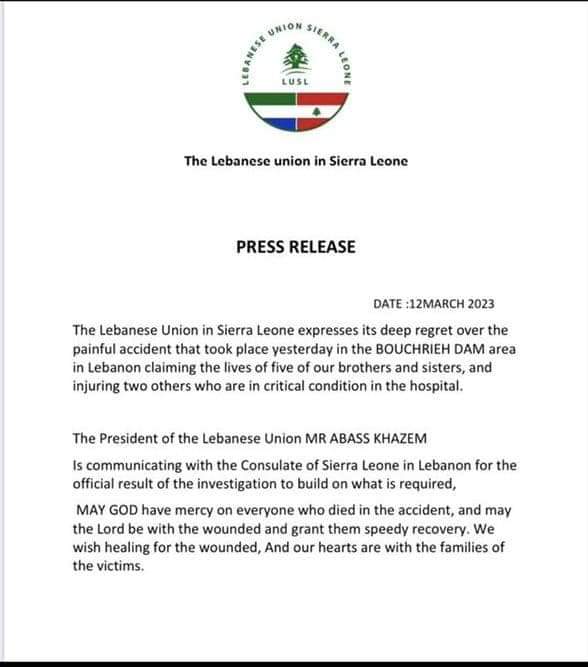 The Lebanese Union in Sierra Leone has in a press release dated 12th March 2023 expressed their regrets over the unfortunate fire incident that involved Sierra Leoneans in Lebanon on Saturday 11th March 2023, leading to the death of five and two in critical condition.