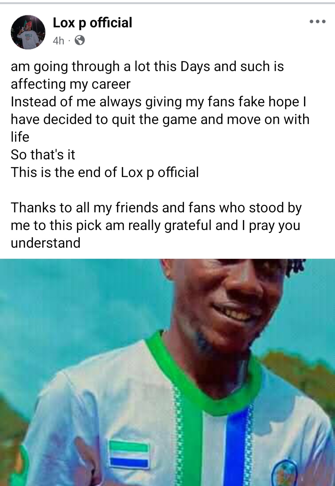 “Am going through a lot these days and such is affecting my career,” Lox P wrote. “Instead of me always giving my fans fake hope, I have decided to quit the game and move on with life.”