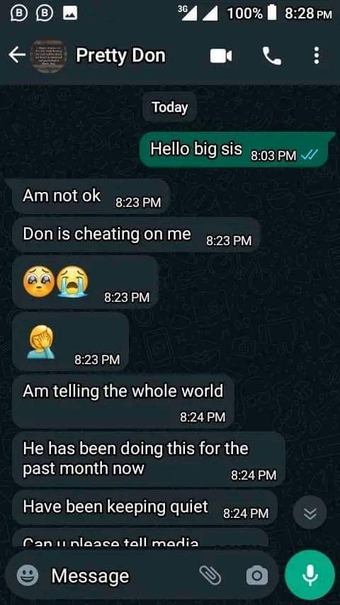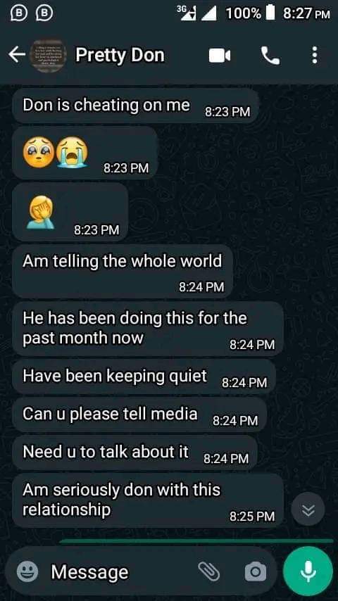 This comes after a post of what was reported to be a Pretty S Whatsapp conversation with a friend appeared on social media, where she made claims of Nega Don cheating on her