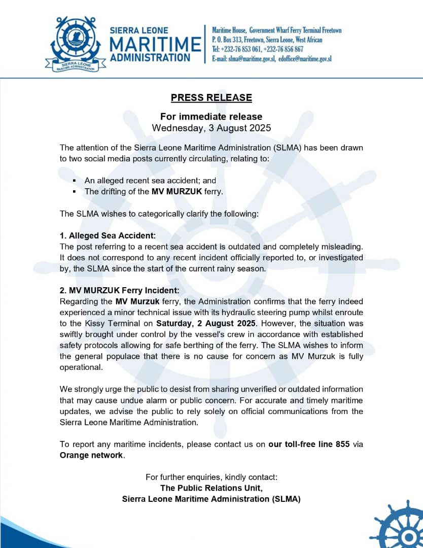 Meanwhile, the SLMA clarified that the MV Murzuk ferry did experience a minor technical issue with its hydraulic steering pump while en route to the Kissy Terminal on August 2, 2025. However, the crew managed the situation effectively, adhering to established safety protocols to ensure the ferry’s safe berthing.