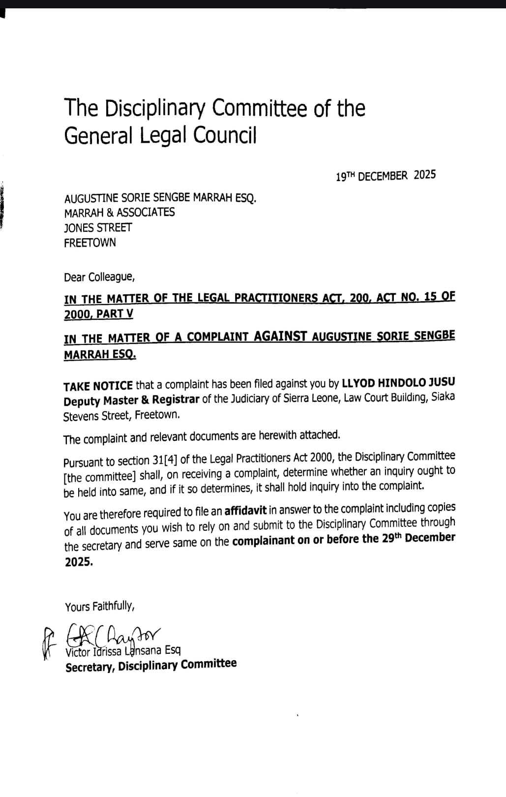 In response to the filing, the Disciplinary Committee of the General Legal Council issued a notice to Marrah on December 19, 2025. Signed by Committee Secretary Victor Idrissa Lansana Esq., the notice confirms receipt of the complaint and invokes the Legal Practitioners Act 2000.