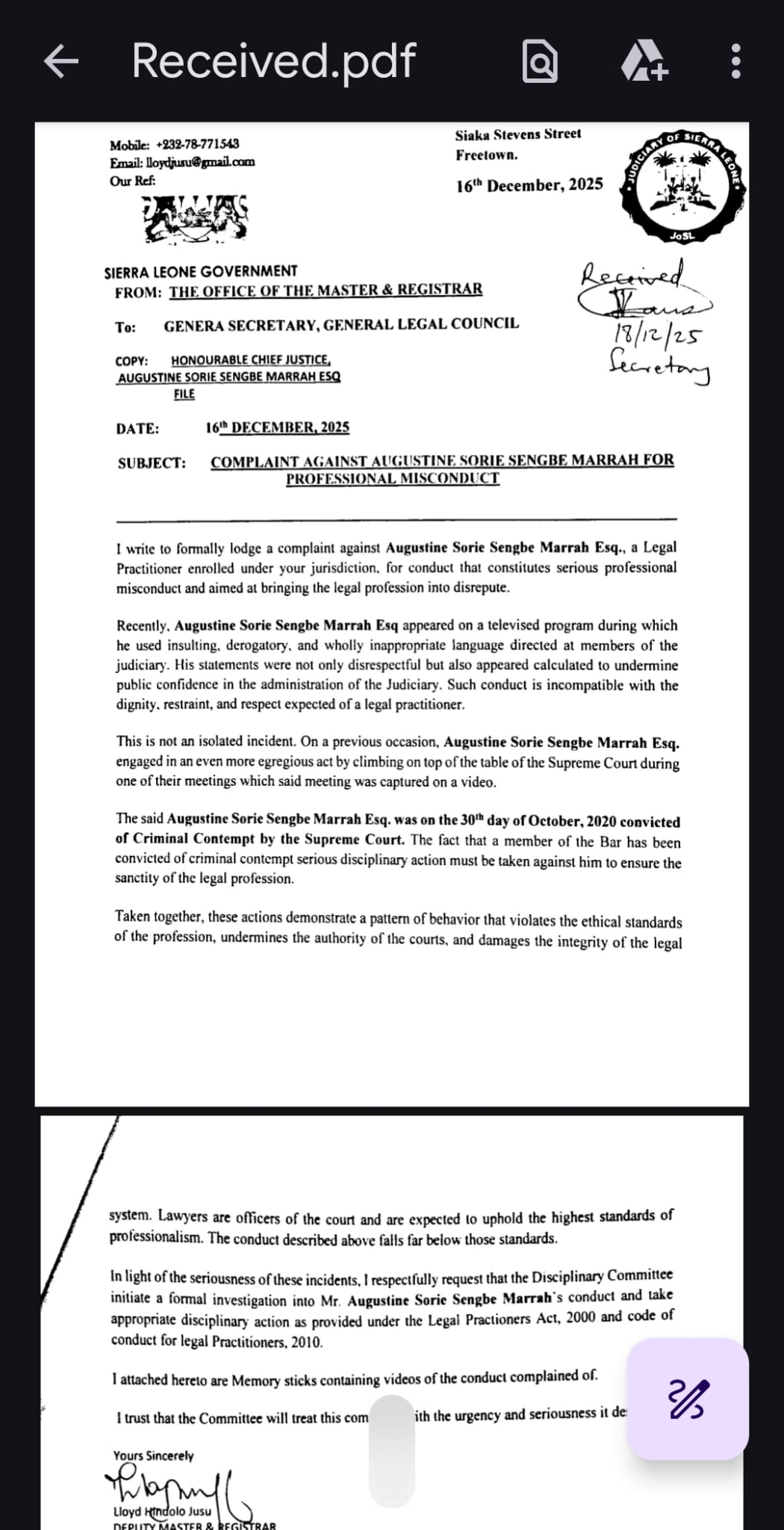 In a letter dated December 16, 2025, Lloyd Hindolo Jusu, the Deputy Master and Registrar, formally requested that the General Legal Council initiate an investigation into Marrah’s conduct.