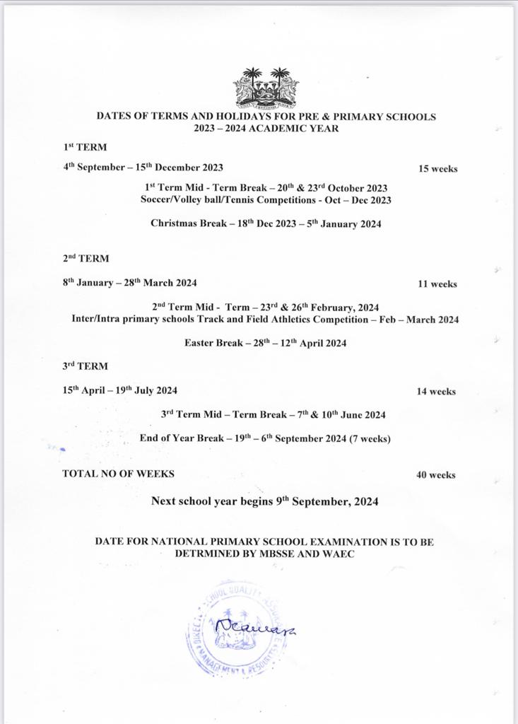 The Ministry of Basic and Senior Secondary Education (MBSSE) has announced in a press release date of terms and holidays for Pre, Primary and Secondary Schools for the 2023/ 2024 academic year.