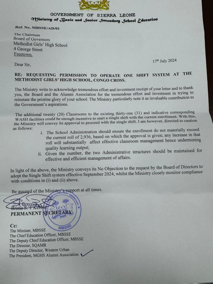 The Ministry of Basic and Senior Secondary School Education has officially granted permission for the Methodist Girls’ High School in Congo Cross to adopt a single shift system, effective September 2024.