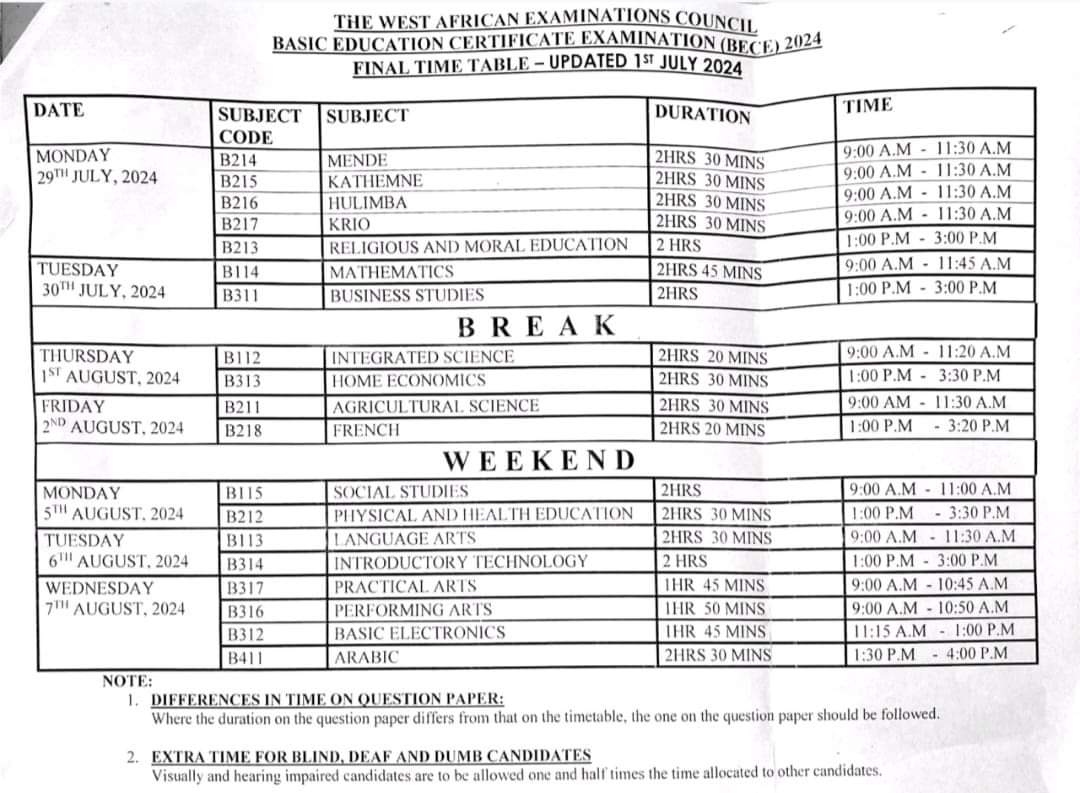 The Ministry of Basic and Senior Secondary Education (MBSSE) has officially released the final timetable for the Basic Education Certificate Examination (BECE) for 2024. This updated version supersedes any earlier timetables that may have been in circulation.